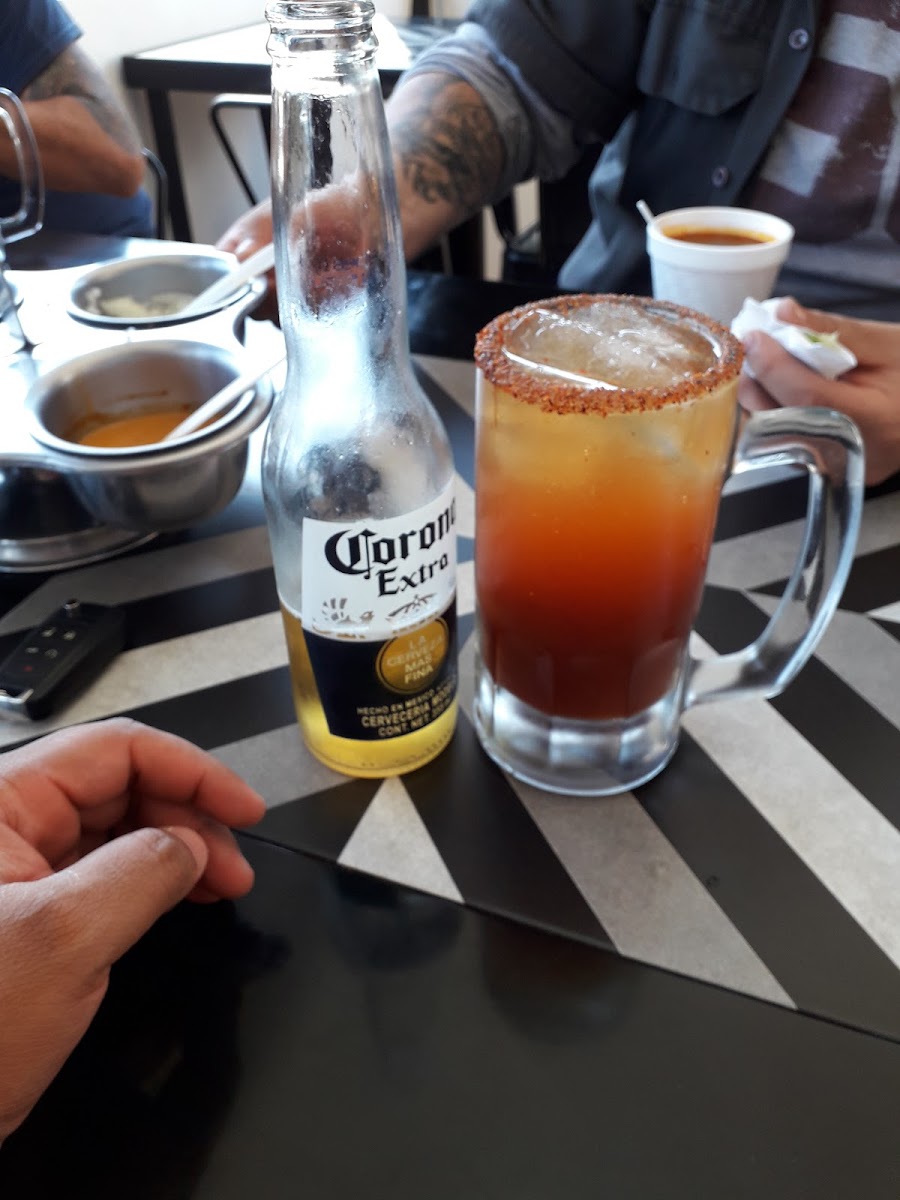 Michelada con cerveza a elegir, salsas de la casa, limón y clamato, 1 l.